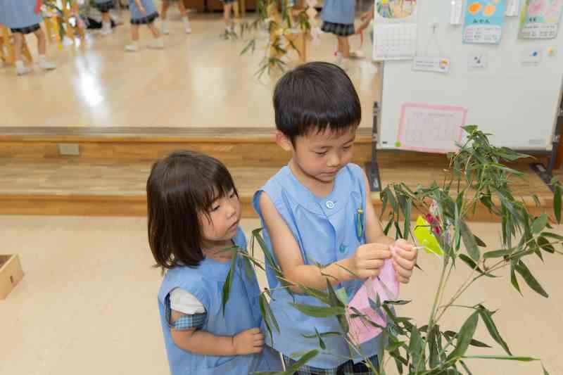 モンテッソーリのお仕事の時間に、切り紙やのり貼りで七夕の飾りを作っていた子どもたち!