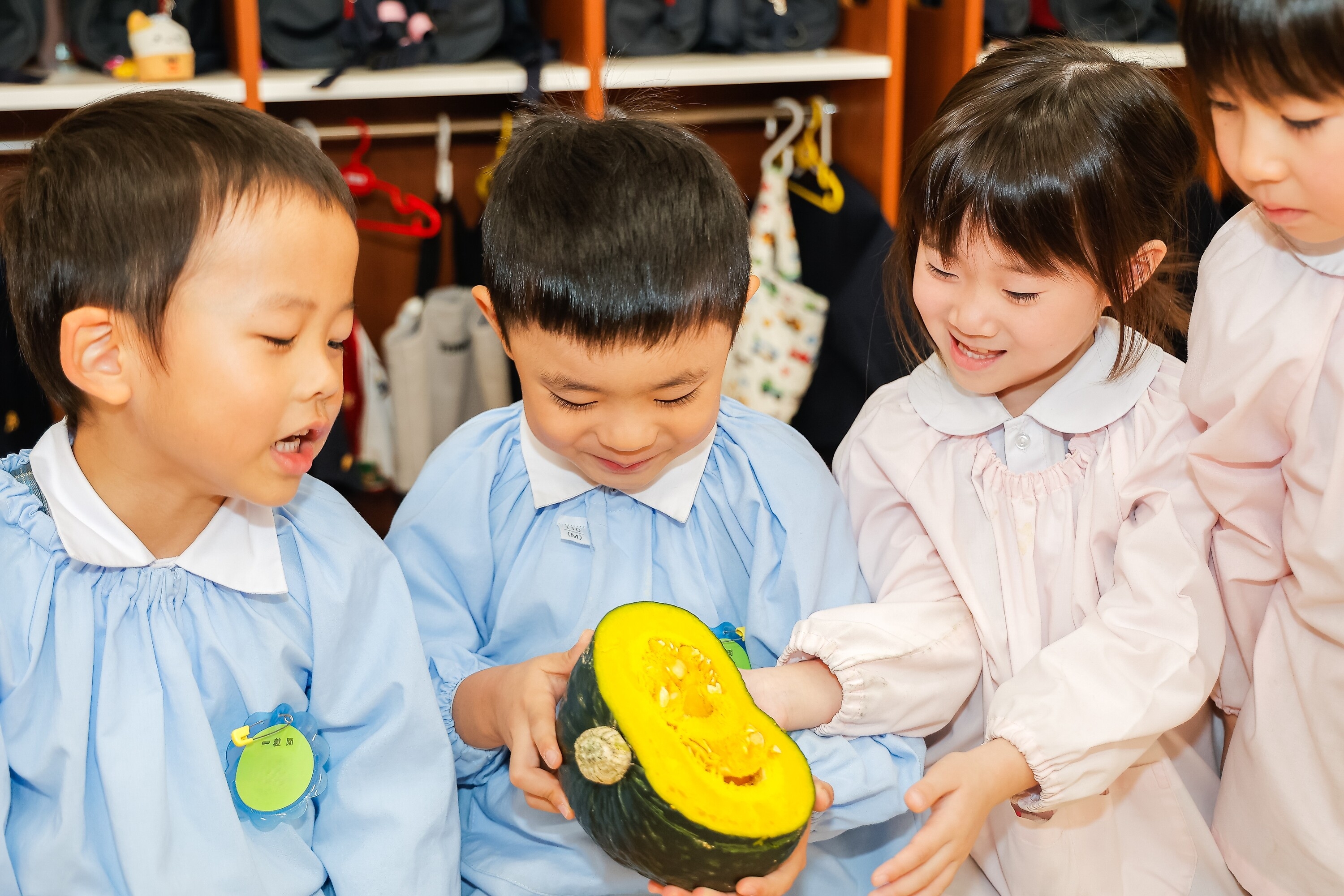 いろいろな野菜や果物を持ち寄って、その匂いを嗅いでみたり、味わってみたり、断面を見比べたりし、